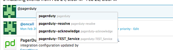 ここまで終わったら、きちんと連携できているか実際に動かして確認してみましょう。Datadog の Event streamで、テキストボックスに @pagerduty と打ち込むと Suggest が出てくるはずです。先ほどIntegrationで設定したServiceを選択します。