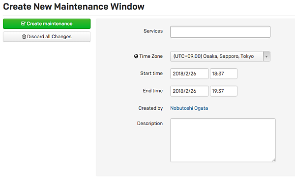 次にMaintenanceに入れたいサービスと時間を設定することで、そのサービスに対するインシデントは指定した時間帯では抑制されます。Maintenance Window内に発生したインシデントについては、完全に無視されてどこにも記録されませんのでその点だけご注意ください。