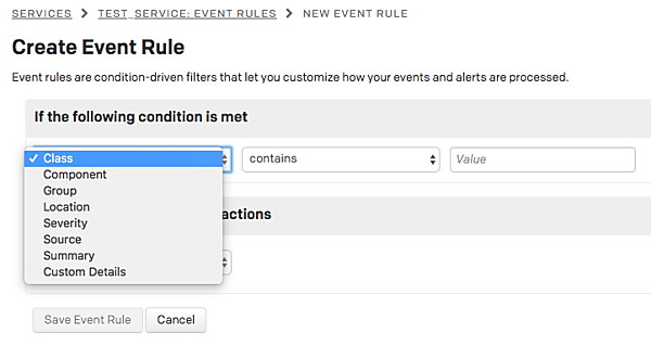 Event RuleはService Detailsの画面にEvent Rulesというタブがあり、そこで設定できます。もしEvent Rulesタブがない場合は、Service設定のIncident BehaviorがCreate incidentsに設定されています。Create alerts and incidentsに変更するとEvent Rulesを使うことができるようになります。