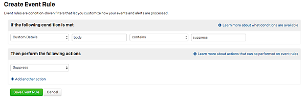実際に試してみるため、以下のようなEvent Ruleを設定してみます。custom detailsのbodyにsuppressという文字が含まれていたらインシデントを抑制します。