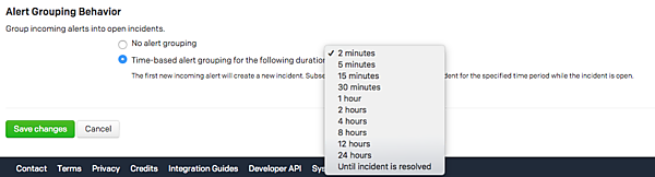 Service設定のAlert Grouping Behaviorで、Time-based alert grouping for the following durationを選択し、抑制したい時間をプルダウンから選びます。