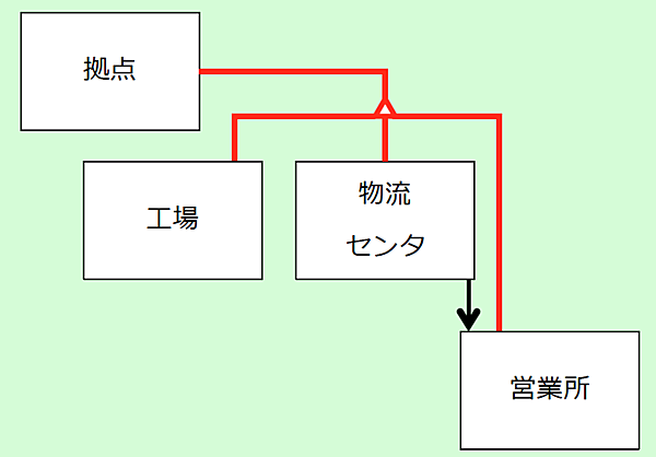 ②にある「生産では,生産年月日,生産した商品,生産数量,生産した商品の入庫先物流センタを記録する」の記載から、エンティティタイプ「生産」に「物流センタ」の主キーである「拠点コード」を参照する外部キーを持つ関連があることがわかります。これらの2つのエンティティタイプ間のリレーションシップは以下の通りです。 また、③にある「営業所は,補充が必要な場合,物流センタに対して補充要求を行う」と「補充要求では,要求年月日,要求元の拠点,要求した商品,数量を記録する」の記載から、エンティティタイプ「補充要求」と要求元の拠点となる「営業所」の間に関連があることがわかります。これらの2つのエンティティタイプ間のリレーションシップは以下の通りです。 さらに、⑤広域得意先直納にある「納入指示では,地域得意先納入の記録の他に,納入する物流センタを記録する」の記載から、エンティティタイプ「広域得意先納入指示」と納入する「物流センタ」の間に関連があることがわかります。これらの2つのエンティティタイプ間のリレーションシップは以下の通りです。