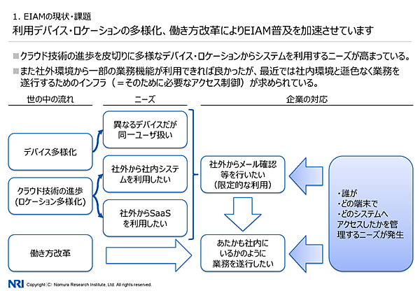 まず現在のEIAMの特徴として、システムがクラウド側に伸びていることが挙げられた。デバイスが増えたことでロケーションが多様化し、さらには働き方改革によって、あたかも社内にいるかのように業務を遂行したいという流れになっているという。