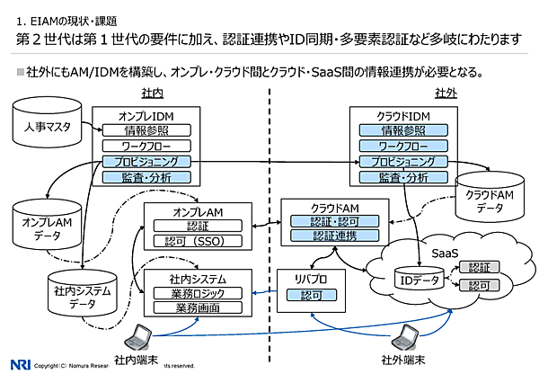また、EIAMを第1世代と第2世代に分類。第1世代は認証・認可とID連携が主な要件となる。そして第2世代はそれに加え、認証連携やID同期多要素認証などの要件が加わる。第2世代は社外環境利用が前提のため、セキュリティ強度とUX向上が求められるという。