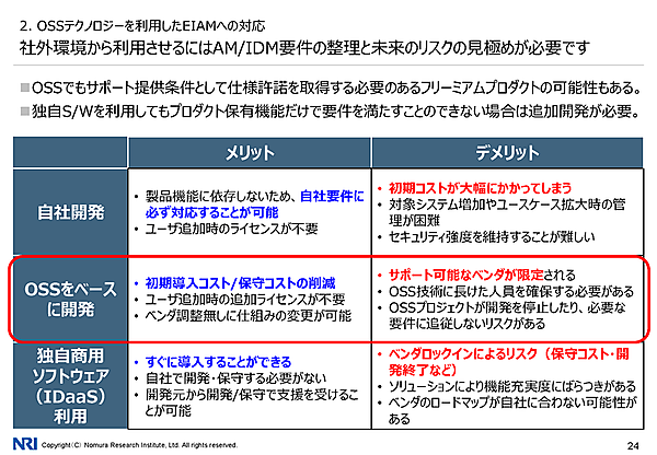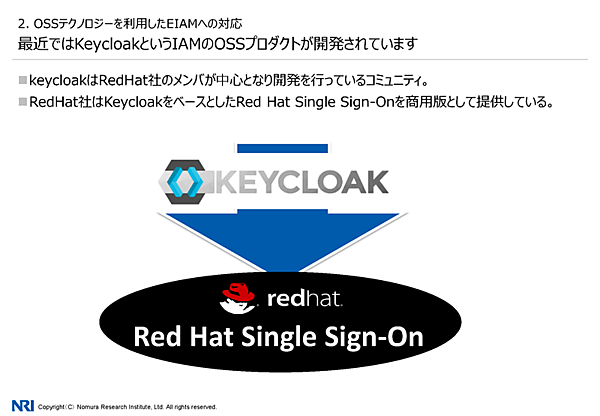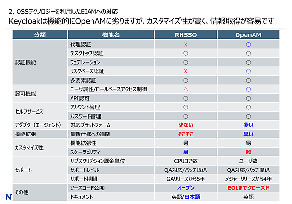 オープンソース技術をベースとしたNRIのEIAMソリューション続いてNRIの三浦純氏(生産革新ソリューション開発三部 主任テクニカルエンジニア)からは、NRIのEIAMソリューションが紹介された。NRI 生産革新ソリューション開発三部 主任テクニカルエンジニア 三浦 純氏まず現在のEIAMの特徴として、システムがクラウド側に伸びていることが挙げられた。デバイスが増えたことでロケーションが多様化し、さらには働き方改革によって、あたかも社内にいるかのように業務を遂行したいという流れになっているという。また、EIAMを第1世代と第2世代に分類。第1世代は認証・認可とID連携が主な要件となる。そして第2世代はそれに加え、認証連携やID同期多要素認証などの要件が加わる。第2世代は社外環境利用が前提のため、セキュリティ強度とUX向上が求められるという。現在のEIAMEIAMの第2世代ではさまざまな要件が加わるそのうえで、NRIによるOSSテクノロジーを利用したソリューションが紹介された。まず、OSSによるソリューションのメリットとして、追加ライセンスが不要であることや、ベンダー調整なしに仕組みを変更できることが挙げられた。一方でデメリットとしてベンダー側もユーザー側もOSS技術に長けた人材が必要であることを挙げた。OSSによるソリューションのメリットとデメリット具体的なプロダクトには、まず「OpenAM」がある。OpenAMはSun Microsystemsで開発されたOpenSSOからForgeRockがフォークしたプロダクトで、EIAMで最も有名なOSSプロダクトだという。なお、OpenAMはForgeRockの方針転換により、2016年よりクローズドソースとなった。NRIは、OpenAM開発元のForgeRock社の販売パートナー契約を結んでいる。NRIが窓口となることで、日本語サポートを含むサポートが提供されるという。OpenAMの概要ForgeRock社との販売パートナー契約最近では、OpenAMに並ぶ「Keycloak」というEIAMソフトにも注力しているという。Red Hat社の商用製品「Red Hat Single Sign-On(RH-SSO)」のベースとなっており、オープンソースで開発されている。Google Trendでチェックすると、OpenAMのクローズドソースのタイミングでOpenAMを上回っているという。KeycloakをOpenAMと比較すると、カタログスペック上の機能はOpenAMに劣るが、カスタマイズ性の高さが長所だという。なお、日本語ドキュメントもあり、これはNRIのプロジェクトによるものだ。Keycloakの概要OpenAMとKeycloakの比較こうしたOSS技術によるEIAMについて、三浦氏はNRIが豊富な事例を持ちノウハウを蓄積していることをアピール。例えば、製造業の事例ではグローバル拠点のIDを一元管理しワークフローに落とし込んだという。また、NRIの社内システムでは、定期的なIDの棚卸し(監査)などを実現したという。NRIのEIAMの事例三浦氏は、まとめとして「NRIはEIAMの要件整理から開発、導入、維持管理、OSS製品サポートまでやっている。お困りのことがあればご相談を」と呼びかけた。