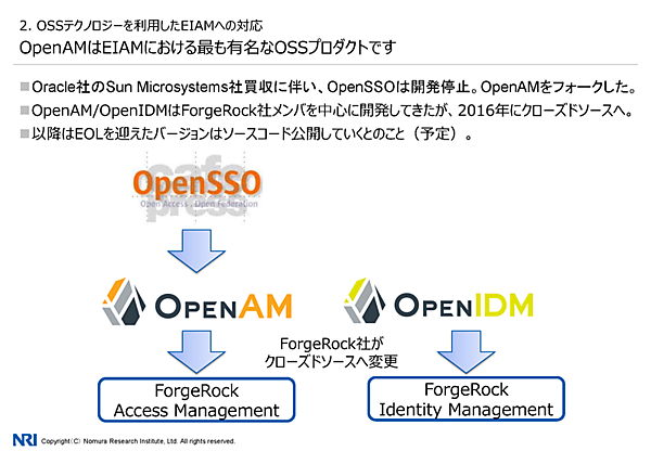 具体的なプロダクトには、まず「OpenAM」がある。OpenAMはSun Microsystemsで開発されたOpenSSOからForgeRockがフォークしたプロダクトで、EIAMで最も有名なOSSプロダクトだという。なお、OpenAMは ForgeRockの方針転換により、2016年よりクローズドソースとなった。