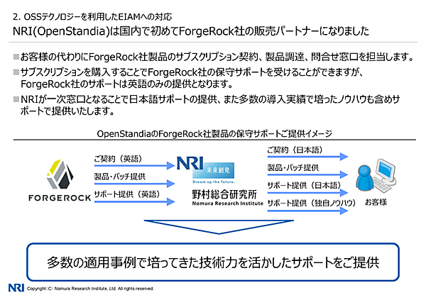 NRIは、OpenAM開発元のForgeRock社の販売パートナー契約を結んでいる。NRIが窓口となることで、日本語サポートを含むサポートが提供されるという。