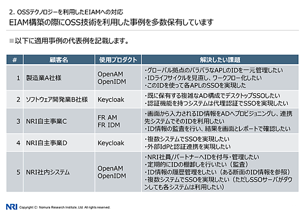 こうしたOSS技術によるEIAMについて、三浦氏はNRIが豊富な事例を持ちノウハウを蓄積していることをアピール。例えば、製造業の事例ではグローバル拠点のIDを一元管理しワークフローに落とし込んだという。また、NRIの社内システムでは、定期的なIDの棚卸し(監査)などを実現したという。
