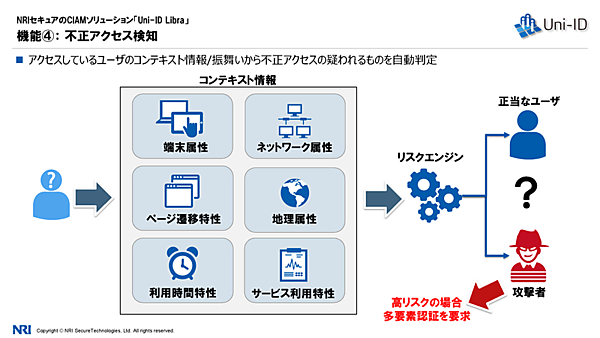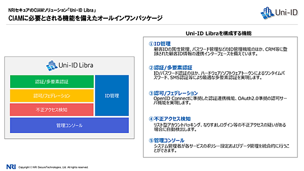 そのうえで、NRIセキュアのCIAMソリューションであるUni-ID Libraが紹介された。Uni-ID Libraは、CIAMに必要とされる機能を備えたオールインパッケージだ。ID管理、認証/多要素認証、認可/フェデレーション、不正アクセス検知、管理コンソールの5つの機能を持つ。