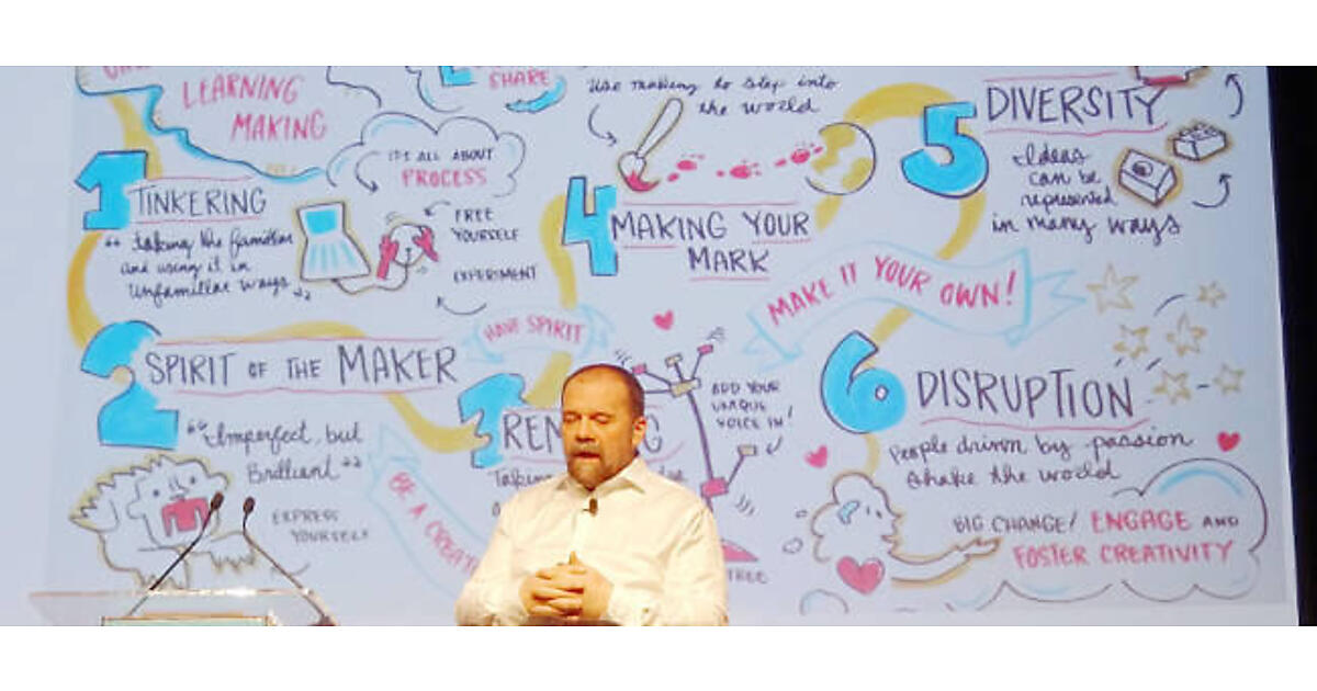 また各種のデバイスやワンボードマイコンで様々な電子工作を行うMAKERムーブメントにも言及し、「Six Amazing things about Making」というスライドを使って、このMAKERムーブメントのコンセプトとArduinoのコンセプトが同じであることを紹介した。ちなみにこのスライドに使われている手描きのイラストは、2013年に行われた「Six Amazing things about Making」というビデオでプレゼンテーションと同時に描かれたものだ。