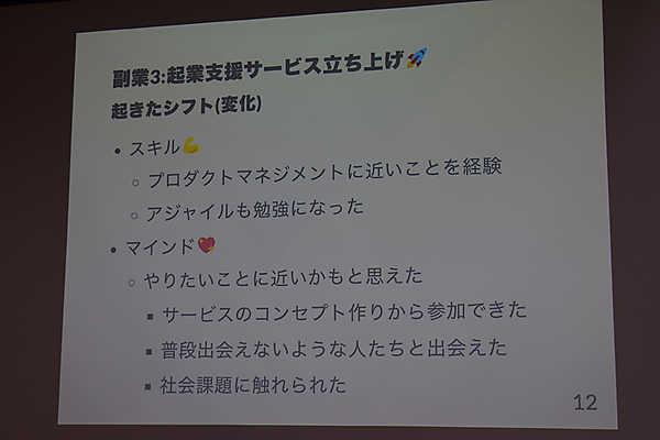 3番目は「起業支援サービス立ち上げ」。これは本業の同僚から紹介された仕事で、事業の内容に共感したことと、立ち上げから参加できる点に魅力を感じたという。ここではサービスの開発だけでなく、内容についてのディスカッションや仕様決め、ピッチイベントなど幅広く関わることができた。その結果、普段は会えない層の人々に出会ったり、社会課題に触れたりといった、エンジニアだけではできない経験を積むことができた。