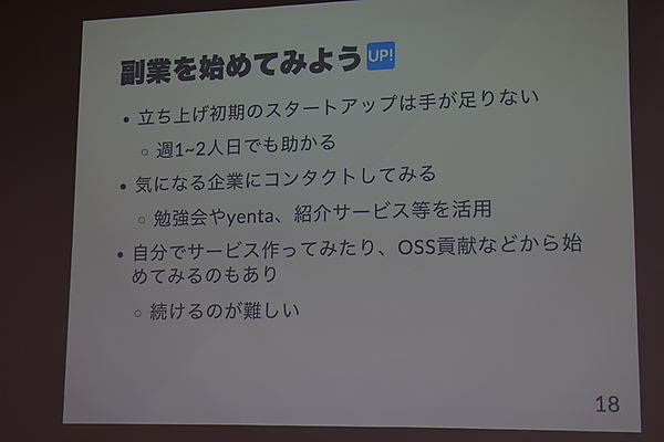 こうした自分の経験をもとに大原氏は、「副業は新しいスキルを身につけたいとき、また既存のスキルを伸ばしたい時に有効だ」と言う。本業ではやりたくてもできないことを副業で経験すれば、いきなり転職や独立するリスクを犯さなくて済む。また社外の凄腕のエンジニアから学ぶチャンスもあるし、上司の評価などを気にしなくていいから純粋に開発が楽しめるというメリットもある。