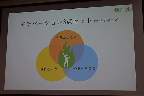 とはいえ、「今日はエンジニアの副業に絞って話したい」と語る岡田氏は、副業に関わる人々を①すでに副業をしている人、②会社が禁じていたり忙しすぎたりなどの理由で副業ができない人、③副業できるがやっていない人の3つのタイプに分類。中でも3番目が最も多い背景として、サイボウズの「モチベーション3点セット」を例に挙げ、副業を始めるのが難しいのは、この中の「べきこと」のモチベーションが弱いからだと指摘する。