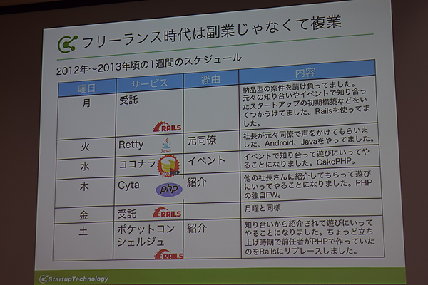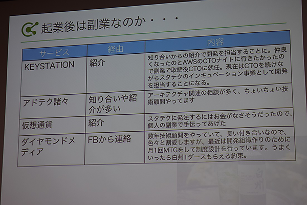 菊本氏の副業キャリアは、サラリーマン当時の社長や部長など上司からの紹介から始まった。その後フリーランスになってからは自ら「副業ではなく複業」と言うように、ほぼ日替わりで週に4本の案件をそれぞれこなす忙しさ。さらに自分で起業してからは、知り合いからの紹介や相談、他社の技術顧問などを引き受けるようになり、もはや「副業」という範疇に収まらない状況になっているという。