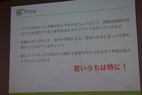 生活費は本業の収入でまかない、複業ではお金より経験を得ることを重視する。若いうちは特にそれが重要。単価にこだわらず、自分の経験や勉強になると思った仕事を優先して請ける。打席に立つ回数を稼ぐように励めば、単価は後からついてくる。