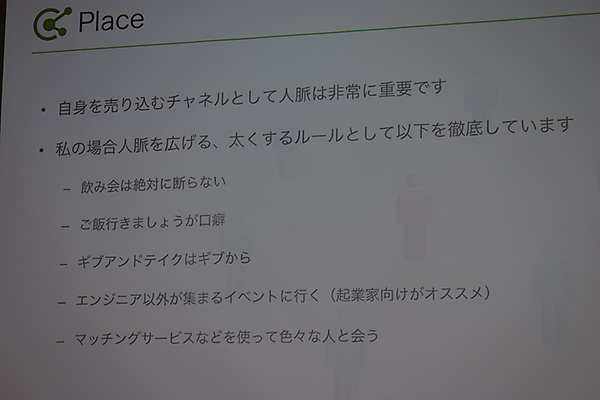 自分を売り込むチャネルとして人脈は非常に大切。菊本氏は人脈作りのルールとして「飲み会は絶対に断らない」「ご飯に行きましょうが口癖」「ギブアンドテイクはギブから」「エンジニア以外の集まるイベントに行く。特に起業家向け」「マッチングサービスなどを使っていろいろな人と会う」を徹底。