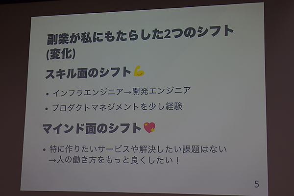 佐藤氏のあいさつに続き、実際の副業経験者によるセッションがスタート。最初に登壇したのは、ファインディ株式会社でエンジニアとして活躍する大原 和人氏だ。テーマは「副業が私にもたらした2つのシフト」。同氏は情報系の大学院を修了後、Webサービスやスタートアップに関心を持ち、新卒入社した会社でインフラ3年、開発1年、技術基盤1年半のエンジニアの経験を積んできた。そうした本業のかたわら、いくつかの副業を経験してきたが、「自分なりにエンジニアとしてのキャリアに悩みつつ、副業を通して次の光明を見出してきた」と語る。