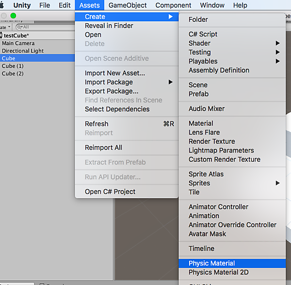 続いて、Cubeが床に当たった時に跳ねるようにしてみましょう。「Assets」→「Create」→「Physic Material」と選択します(図14)。
