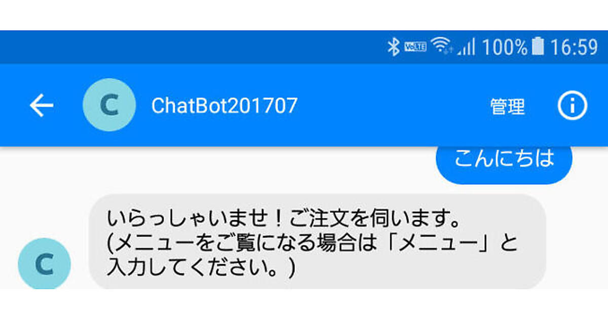 ここまで設定が完了したら、ようやくChatbotとFacebook上で会話できるようになります。Facebookの自分のページから「Messenger」でFacebookページの「ChatBot201707」に話しかけてみましょう。作成した通りChatbotと会話ができれば成功です!