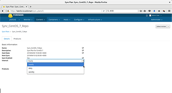 なお、Productとレポジトリの登録方法も、前出のインストールガイドに詳しく書かれています。今回の例ではCentOS 7.4のbaseレポジトリとupdateレポジトリを「CentOS_7」というProduct名で登録して管理しています(図5)。インターネットからのレポジトリ更新スケジュールも「Sync Plan」として設定できます(図6)。