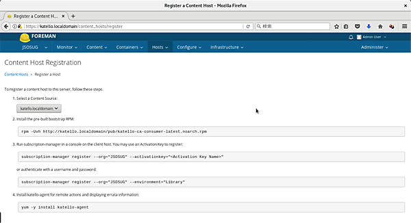 最初にホストを登録したい組織(今回の例ではJSOSUG)を選択しておき、画面上部のメニューから「Hosts」→「Content Hosts」と選択して「Register Content Host」をクリックするとホストを登録する手順が表示されるので、その手順に従います(図7、図8)。また、登録したホスト情報をEditすることで、ホストの管理(Manage) やOSの登録などを行えます。