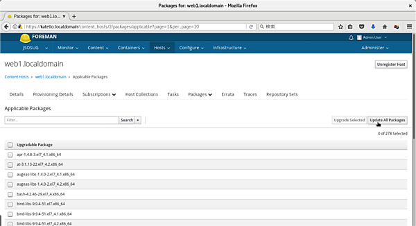 Katelloに登録して管理されているホストは、Katello内にダウンロードしたレポジトリと比較して、バージョンが古い場合はパッケージを更新できます。これにより、パッケージの更新を一括して集中監視できます。また、更新は一括/個別を選択して行うことができます(図9、図10)。