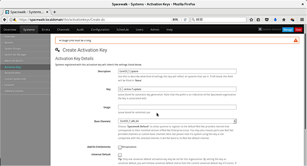 「Spacewalk-Client」をインストールして、既存のサーバを管理対象として登録できます。Spacewalk-Clientのインストール方法とホストの登録方法については、こちらのドキュメントを参考にしてください。具体的にはSpacewalkでActivation Keyを作成し(図14)、管理するホストに手動でspacewalk-client/rhnのRPMパッケージをインストールします。