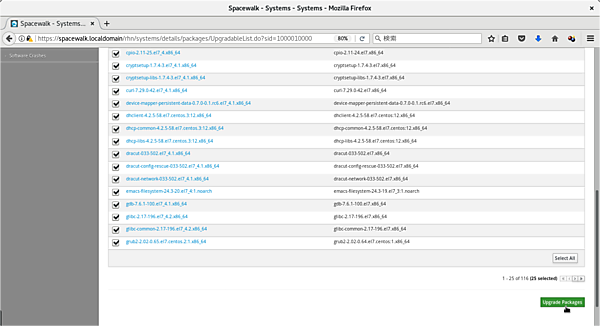 Spacewalkに登録して管理しているホストは、Spacewalkにダウンロードしたレポジトリと比較して、バージョンが古い場合はパッケージを更新できます。一括もしくは個別で更新することもできます(図15)。