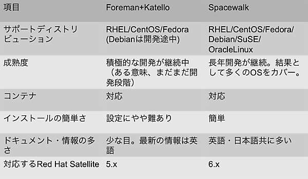 最後に、Foreman+KatelloとSpacewalkの機能比較を図16にまとめました。Spacewalkの方が成熟度や対応するディストリビューションも多く、ドキュメントも多めです。