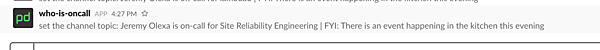 AWSとSlackが前提になってしまいますが、定期的にAWS LambdaがPagerDutyのAPIからオンコール担当を取得し、Slackの特定のチャンネルトピックを更新してくれます。