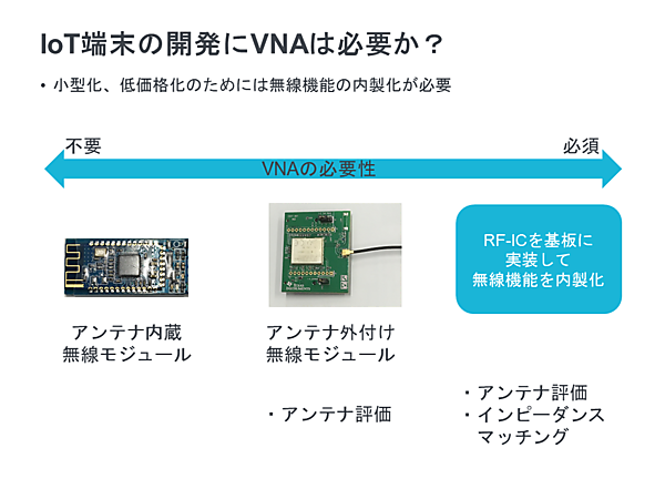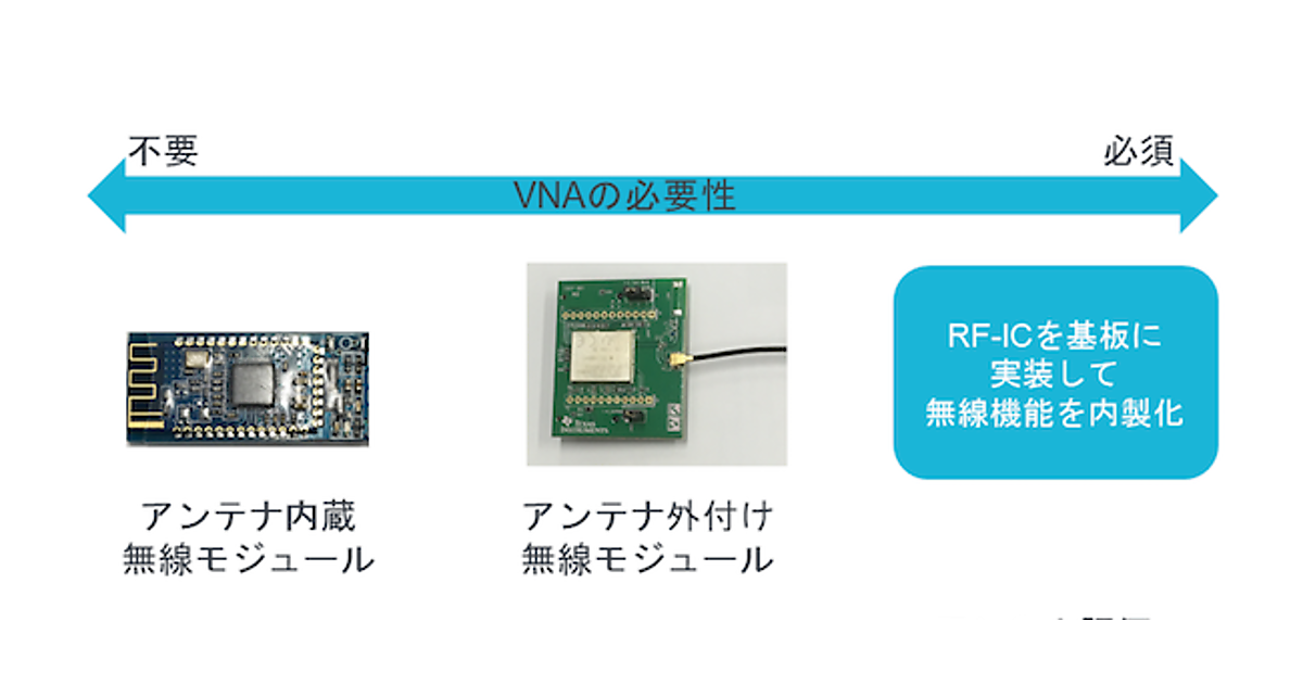 無線通信機能を内蔵したIoTデバイスを開発するにあたって、VNAは必要でしょうか?アンテナ内蔵の無線モジュールを購入して組み込むだけであれば、VNAを使用する必要はありません。アンテナ外付けの無線モジュールを使用する場合は、実装時のアンテナの特性を測定するためにネットワーク・アナライザはあったほうがよいです。無線モジュールを購入した場合には設計は楽になりますが、IoTデバイスの生産台数が多い場合は無線モジュールを使用するとデバイスの単価を下げることができず、小型化にも限界があります。