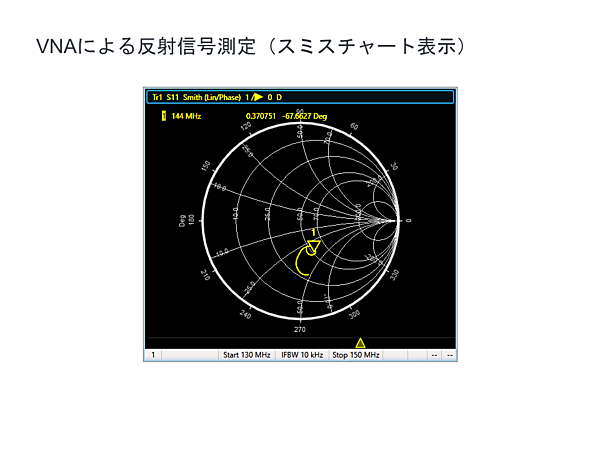反射信号の振幅と位相を極座標表示で表示した例です。中心からの距離が反射信号の強度、角度が反射信号の位相を表します。各周波数での反射量と位相の値をプロットしています。