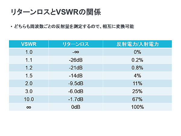 ネットワーク・アナライザでは指定した周波数の信号をアンテナに入力して、反射してきた信号の電力を測定します。アンテナでの反射量はVSWR(Voltage Standing Wave Ratio:電圧定在波比)として測定できます。VSWRの値は1.0が最良(反射量が0)で、数値が大きくなるほど反射量が大きくなります。信号の反射量を表す項目として、リターン・ロスもありますがVSWRとリターン・ロスは表現が違うだけで測定内容は同じです。VSWRとリターン・ロスは相互に変換が可能です。