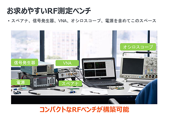 従来は無線機能を搭載した機器を開発するためには大形の測定器を何台も用意する必要があったため専用の実験室が必要でしたが、テクトロニクスのRF測定器ラインナップは小型の製品が揃っており、通常の事務机の上でもRF機器の測定が可能になっています。