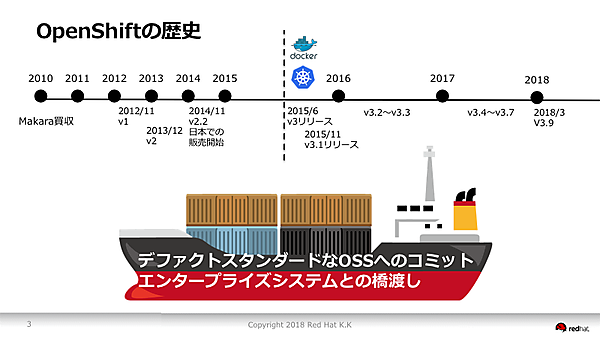 まず冒頭のスライドはOpenShiftの歴史と題されたものだ。OpenShiftの2010年からの歴史を振り返るもので、一番最初に挙げられているMakaraの買収が起点となる。この当時はPaaSと見做されていたRed HatのCloud Foundationはその後、OpenShiftとしてリブランディングされて2012年にv1.0がリリースされることになる。