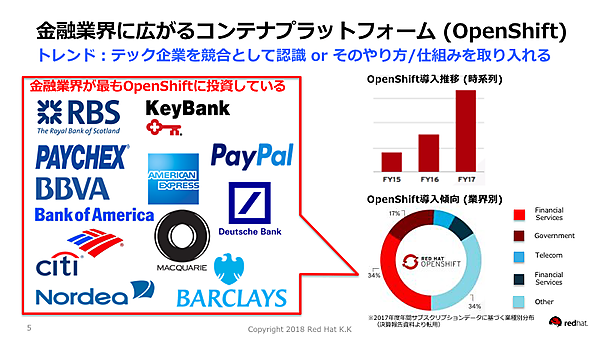そして利用が拡がるOpenShiftのグローバルでの顧客層に関しては意外なことに金融業界が多いという。日本では信頼性重視で保守的な業界と言える金融業においてユースケースが拡がっているのは非常に興味深い。FinTechに代表される破壊的なイノベーションに対抗するために既存の投資を無駄にせずにモダンなアプリケーション開発に向かえるというのがその理由だろうか。シンガポールなどの政府機関においても利用が拡がっているということも合わせてより深く内容を聞き込みたいポイントとなった。