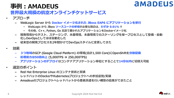 良く引き合いに出される大規模なユースケースとして世界最大級のチケット予約システムであるAmadeusに関しても詳しい概要を紹介。一日に16億件以上のトランザクションをさばくシステムとしてWebLogicとC++によるシステムが5,000以上のサービスとして稼働していたものをJBossのサービスにコンテナを用いて移行、更に3つのリージョンに拡がるGoogle Cloud Plarform上のOpenShiftで稼働させたという。この際にRed Hatから要員が派遣されて協同で開発が行われことも合わせて紹介された。
