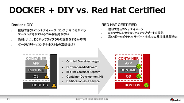 特に須江氏が強調したのはDockerと手作業で構成されたコンテナイメージにおけるリスクの部分だ。これはオープンソースソフトウェアには往々にして発生する、自社でアプリケーション実行のためのコンテナイメージをビルドする際に脆弱性などが紛れ込んでしまうことを如何に回避するのか? という問題に対して、OpenShiftによるパッケージではその部分の安全性をRed Hat自体が与えるというものだ。