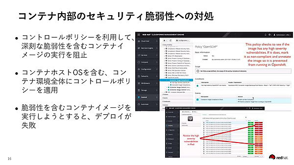 ポリシーに基づいてコンテナ内部の脆弱性を検知して実行を防ぐ機能についても解説が行われた。