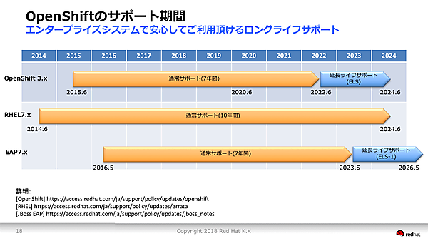 またオープンソースソフトウェアが日夜進化していくのは賛成だが、安定的に稼働させたい、そのためには安定稼働しているプラットフォームはなるべく手を入れたくないというのは運用管理者の心理だろう。それを7年または10年という期間に渡ってサポートを提供するロングライフサポートに関しても紹介が行われた。OpenShiftにおけるサポートは常に進化し続けるKuberbetesに安心を与えるためには大きな意味があると思われる。