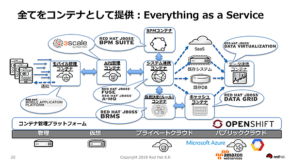 そして「全てをコンテナとして提供」というスライドではインフラストラクチャーではなくRed Hatが主にビジネス向けに提供しているソフトウェアについてもコンテナ化して稼働させ、それをOpenShiftの上で稼働させることを紹介。ここではプライベートクラウドだけではなくAzureやGCP、AWSなどのマルチクラウドをもカバーすることでBRMSなども一括管理できることを訴えた形である。
