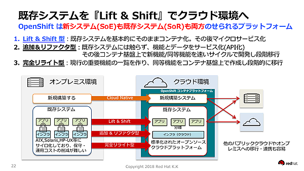 そしてコンテナ化における方法論として、リフト&シフト、クラウドネイティブアプリケーション、ハイブリッド、ビジネスイノベーションの4つがあると紹介した。ここでのポイントはレガシーなアプリケーションもクラウドネイティブアプリケーションも同様にしてOpenShiftで実行できるという部分だ。全てのアプリケーションがクラウドネイティブであるというのはベンチャー企業でもなければあり得ないわけで、如何にクラウドネイティブな方向に自社のシステムを誘導していくのか? という命題に対する一つの回答ということだろう。