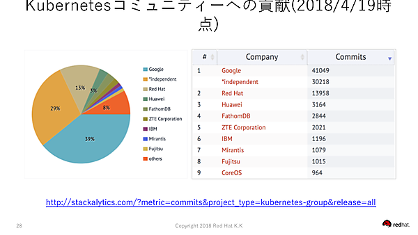 次に紹介したのはKubernetesコミュニティにおけるRed Hatの協力という内容だ。組織としてのコントリビューションはGoogleに次いでコミットが多いというもので、同様にKubernetesのSIGとして存在する30のプロジェクトのうち、13のプロジェクトについてはRed HatもしくはCoreOSのエンジニアがチェアというポジションにいることを紹介した。Kubernetesの開発に相当なリソースを投じていることがわかるエピソードとなった。