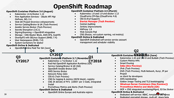 また将来のOpenShiftのロードマップも紹介された。ここではサービスメッシュを実現するIstioについて3.10というバージョンで組み込まれることが解説された。