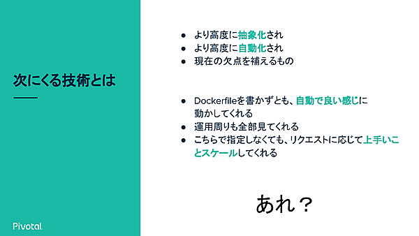 これはつまり、昔からあるPaaSだ。Pivotalが開発する「Cloud Foundry」もPaaSプラットフォームである。現在のPaaSは内部ではデプロイされたコードがコンテナとして動くことが多い。開発者はコンテナについて意識する必要はないが、コンテナ活用方法の1つと言える。「中身はそのときどきで変わる。コンテナであろうとなかろうと、PaaSが提供したい価値は変わらない。もしコンテナが廃れてもPaaSの考え方は廃れない」(草間氏)。
