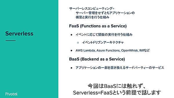 PaaSよりさらに抽象度が高いものにServerlessがある。なお、一般にServerlessはFaaS(Function as a Service)とBaaS(Backend as a Service)の2種類あるとされているが、草間氏はFaaSに絞って解説するとした。
