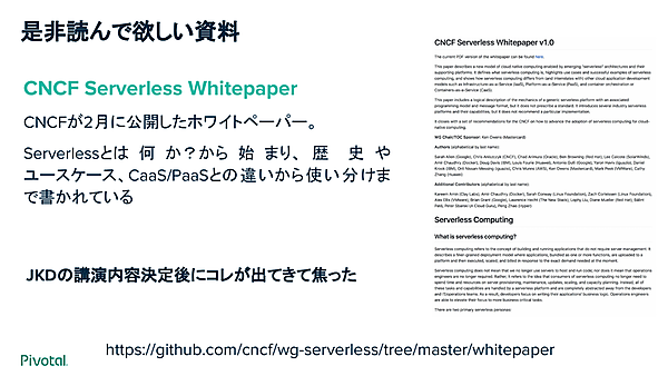 さて、コンテナプラットフォーム(CaaS)とPaaS、Serverlessの3つの選択肢は、それぞれメリットとデメリットがある。これについて草間氏はCNCFが2月に公開したホワイトペーパー「CNCF Serverless Whitepaper」がよくまとまっていると紹介し、これを参考にしながら説明した。