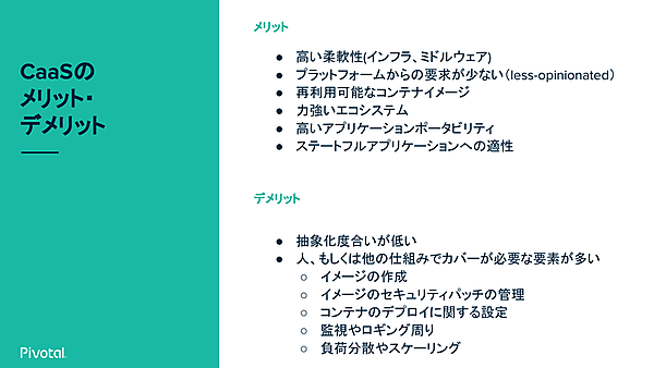 まず、CaaSのメリットには柔軟性やツール、再利用できるコンテナイメージなどのエコシステムがある。また、Kubernetesではステートフルなアプリケーションも対応するようになっている。一方、デメリットとしては冒頭で語られた「コンテナ疲れ」が挙げられた。