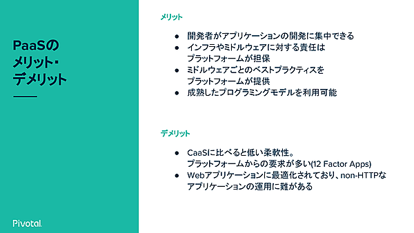 PaaSのメリットは、アプリケーションのことだけ考えれば良い点だ。デメリットは、CaaSに比べると柔軟性に欠けることがある点だ。