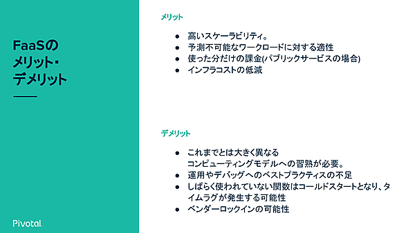 FaaSではアプリケーションの作り方が変わる。また、コンテナやPaaSではあらかじめスケールさせる必要があるが、Serverlessは必要なときだけ呼ばれるため、自動的にスケールするという特徴がある。なお、Serverlessも実装としては中ではコンテナが使われており、これもコンテナの活用方法の1つだ。